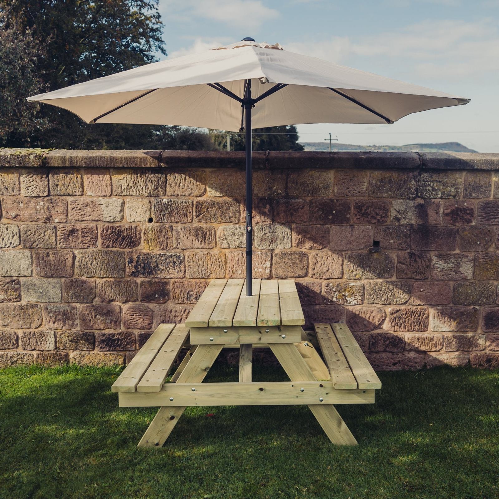 The Benches are handmade in the UK and are Eco-friendly as only sustainably sourced timber from Scandinavian forests is used. The benches are also pressure treated to prevent rot and decay for up to 20 years. Built for durability and affordability these benches have a 50mm parasol hole to table top.